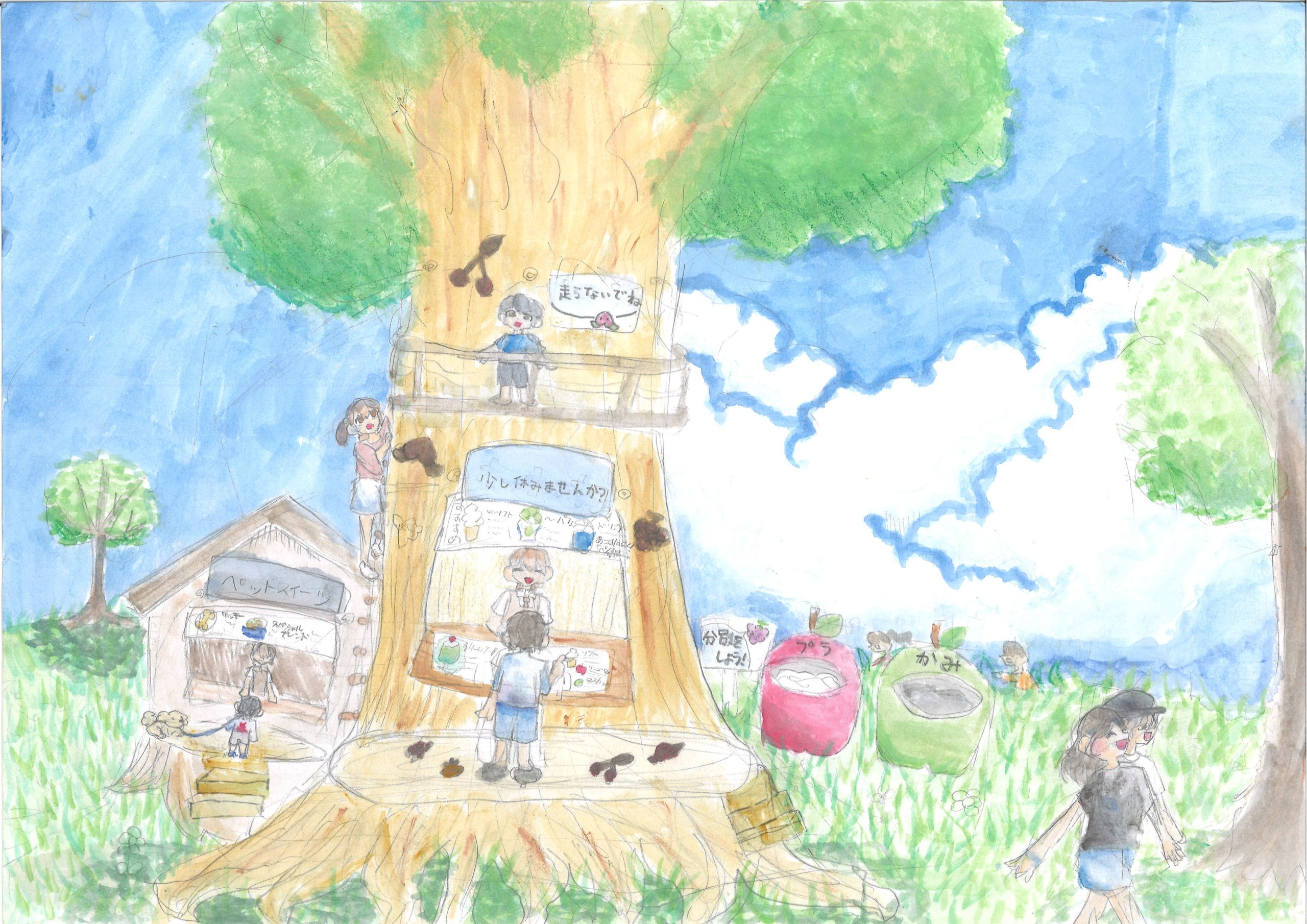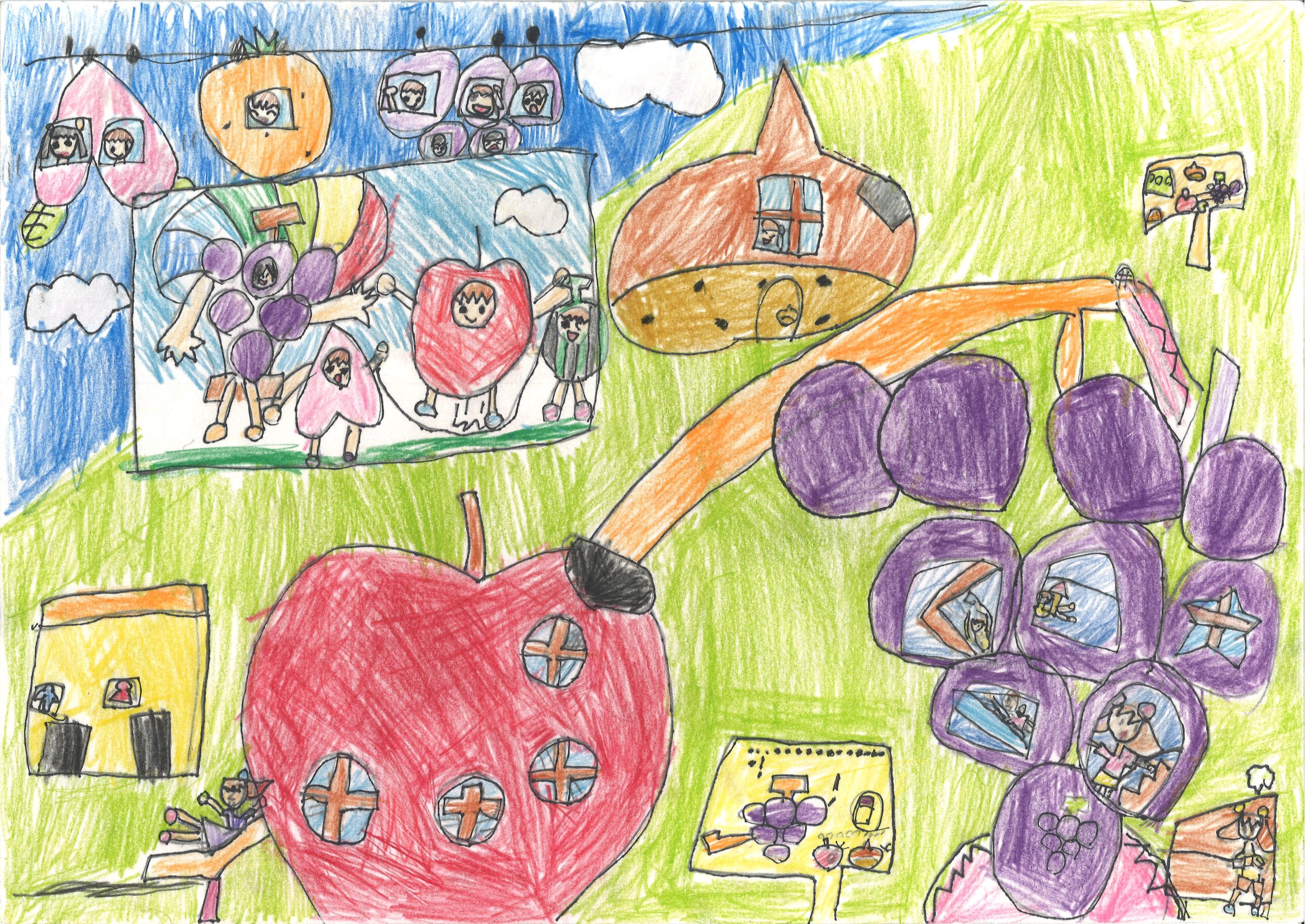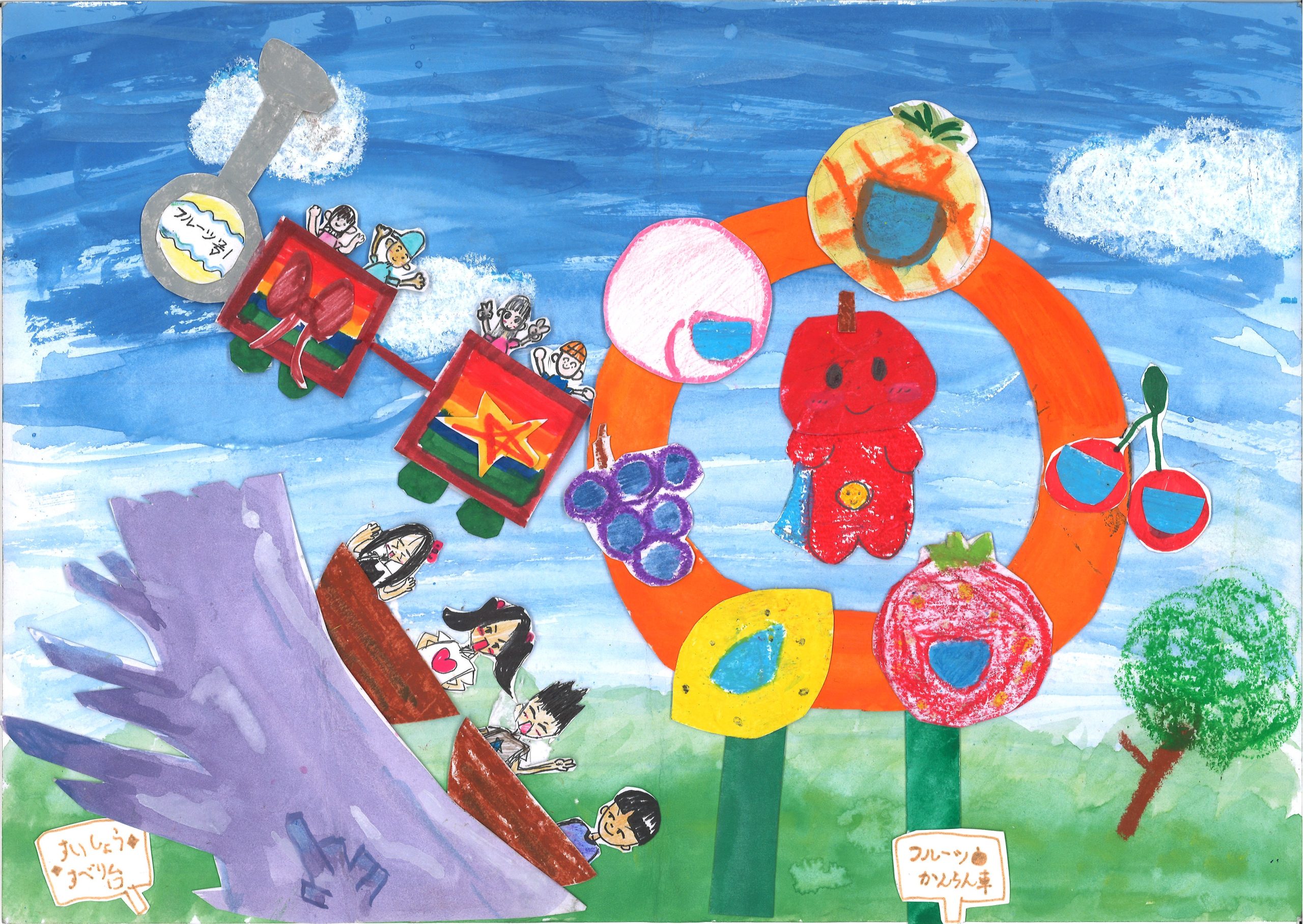 「30年後のフルーツ公園」をテーマに地元の小学生たちが未来の姿を自由に描いてくれました。