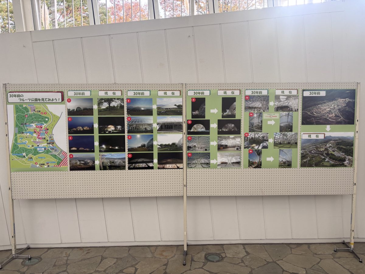 笛吹川フルーツ公園は、今年で開園30周年を迎えました。 これを記念して、「30年前」と「現在」の写真を、くだもの広場下段入口付近に展示しております。 開園当時と、今の公園の姿を見比べながら、時の流れや公園の歩みを感じていただける内容となっています。 展示は3月末まで行っておりますので、ぜひご覧ください。