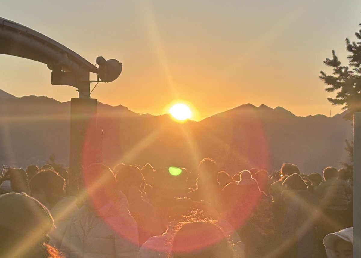 2026年元日早朝より、笛吹川フルーツ公園の最上部にある丘の駅桃源郷フルーツセンター前広場で、「New Year Festival 2026~HAPPY! 初日の出~」が開催され、東の山の山頂が徐々に輝きはじめ、山梨市民吹奏楽団の演奏後、太陽が見え始めると、県内外から訪れた方々の大きな歓声とともに、広場一面に笑顔が広がりました。