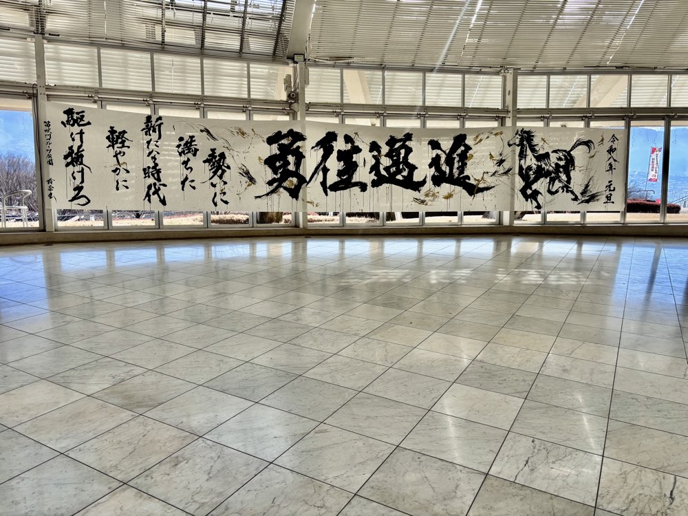 書作家の玲奈さんが、10mの大型看板に書道パフォーマンスで書き上げた作品を、くだもの広場ステージに展示中です!!